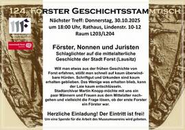Will man etwas aus der frühen Geschichte von Forst erfahren, stößt man schnell auf kaum überwindbare Hürden. Schriftgut und Urkunden sind spärlich erhalten. Fünf große Stadtbrände haben vieles an Unterlagen vernichtet. Das Wenige was erhalten blieb, kann der Laie kaum entschlüsseln. Unter dem Titel „Förster, Nonnen und Juristen - Schlaglichter auf die mittelalterliche Geschichte der Stadt Forst (Lausitz)“ möchte Stadtarchivar Martin Knopp beim 124. Forster Geschichtsstammtisch einigen Männern und Frauen aus dem