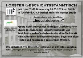 Der Themenmonat Mai zur 750. Jahrfeier steht unter dem Motto „Industrie-Kultur“ und der Geschichtsstammtisch am 28.5.2015 nimmt das vorgegebene Motto ganz wörtlich auf.