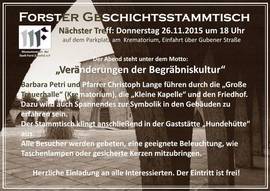 Der letzte Geschichtsstammtisch in 2015 stellt sich wieder ganz unter das Motto des Themenmonats November mit dem Titel „Glaube, Trauer, Hoffnung – religiöses Leben in Forst“. Dabei nimmt der Stammtisch die verschiedenen Begräbniskulturen in den Blick. Mit Barbara Petrie und Pfarrer Christoph Lange geht es in einer nächtlichen Wanderung durch die „Große Trauerhalle“ (Krematorium), die „Kleine Kapelle“ und über den Forster Friedhof. Treffpunkt ist am 26. November um