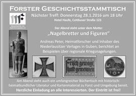 Am Donnerstag, 28. Januar 2016 berichtet zunächst der Heimatforscher und Inhaber des Niederlausitzer Verlag in Guben, Andreas Peter, über regionale Kriegsnagelungen in der Zeit des Ersten Weltkriegs. Die Blütezeit dieser Bewegung lag vor rund 100 Jahren als auf den Schlachtfeldern in West- und Osteuropa Millionen Soldaten umkamen oder verstümmelt wurden.