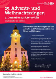 Forster Chöre und Instrumentalisten bringen in stimmungsvoller und besinnlicher Atmosphäre bekannte Advents- und Weihnachtslieder zu Gehör und laden zum Mitsingen ein.