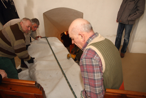 Die Sanierung der Brühl-Gruft in der Forster Stadtkirche steht kurz vor dem Abschluss. Unter ständiger Begleitung durch die Denkmalpflege wurde in den vergangenen Monaten die Gruft aufwendig saniert. Die in diesem Zusammenhang ausgelagerten schweren Kupfer- und Zinnsärge konnten in den letzten Tagen nun wieder in die Gruft zurückgeführt werden.