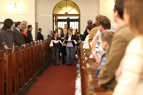 Festgottesdienst zur Einweihung des neuen Altarraumes in der St. Nikolai - Kirche in Forst 20.05.2013 20:50 - [mj] Zum Ansehen der Fotos in der Bilderstrecke auf eines der Fotos klicken Feierlich ist heute um 14.00 Uhr die neue Altargestaltung des Brieselanger Künstlers Helge Warme am Pfingstmontag in Forst in einem Gottesdienst eingeweiht worden.Der gesamte Gemeindekirchenrat zog mit Altartuch, Kreuz, Kelch und Messbuch sowie Kerzenleuchter ein und stellt sie dann feierlich auf und neben dem neuen Altar ab. Wunderschöne große Blumenarrangements in groben Steingutvasen wurden ebenfalls feierlich nach vorn getragen. Helge Warme sprach nach den Ausführungen des Pfarrers Lange dann auch sehr gerührt ein paar Worte, wie es überhaupt zu diesem neuen Altar und seinen Ideen dazu kam. Er stellte sein Arbeitsteam vor, ohne die er diese Aufgabe nicht bewältigt hätte. Frank Hentschel vom Kirchenbauverein übergab erste Vorentwürfe eines neuen Büchleins der Forster Kirchen-Geschichte. Zirka 4 Jahre dauerte die Planung der Gestaltung, und heute konnte das wirklich wunderschöne Ergebnis begutachtet und bewundert werden. Vergoldete Akazienhölzer - als Rahmen des Altares zieren nun den neuen Altar,umgeben von einem dezent getönten und gestalteten Glasvorhang, der aus 140 Platten besteht. Dieser soll an die frühere Geschichte der einst blühenden Textilstadt erinnern. Die zarten pastellfarbenen Muster des Vorhanges widerspiegeln sich auch in den 2001 gestalteten 3 Fenstern-und lassen das Gesamtbild jetzt sehr harmonisch erscheinen. Die noch fehlenden in dieser Art gestalteten Fenster an der Seite sind dann demnächst in der Planung-und auch für diese ist der Künstler Helge Warme verantwortlich,. Spenden der evangelischen Gemeinde ließen dieses Vorhaben unter anderem erst realisieren. 1945 wurde die gesamte Kirche zerstört. Nun ist sie wieder ein Stück schöner geworden. Den Spuren von Helge Warme kann man übrigens in der Kirche Horno-Forst, der Forster Trauerhalle und der Kirche in Mulknitz nachgehen. Nebenbei konnte man schon einen kleinen Vorgeschmack auf die neue Brühlgruft bekommen, Nachdem der alte Eingang wiederentdeckt wurde, ist der Sarg des Grafen Brühl derzeit zur aufwendigen Restauration. Im Herbst wird die neu gestaltet Gruft dann feierlich eingeweiht. Ein Besuch mit dem neuen Schmuckstück lohnt sich unbedingt. |