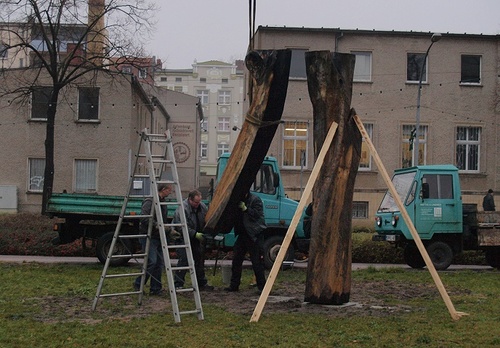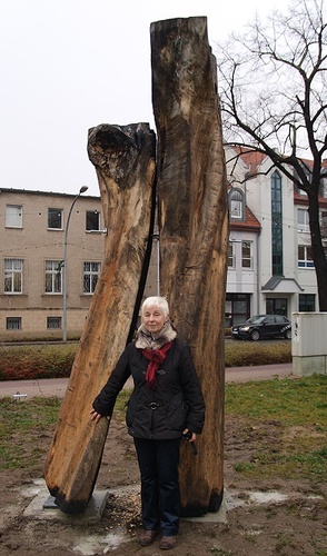 1. Internationales Kunstsymposium der Rosenstadt Forst (Lausitz) – „Body 13“, die Skulptur von Margret Holz, ist heute an ihrem endgültigen Standort angekommen 11.12.2013 14:49 - Helmut P. Fleischhauer Zum Ansehen der Fotos in der Bilderstrecke auf eines der Fotos klicken Am 23. Mai 2013 begannen 16 Künstlerinnen und Künstler auf dem Platz vor dem historischen Eingang des Ostdeutschen Rosengartens mit der Umwandlung von 16 Stämmen der am Kegeldamm gefällten Kastanien in Skulpturen. Die Idee des Kunstsymposiums hatte im Januar Sabine Lindner und mit Hilfe ihrer Mitstreiterinnen und Mitstreiter wurde diese Idee kurzfristig umgesetzt. 13 der während des Symposiums entstandenen Skulpturen haben ihren Platz auf der Reisgwehrinsel gefunden und erfreuten dort bereits während der Deutschen Rosenschau die Besucher. Die Skulptur „AndersWo“ von Jan Witte-Kropius hat ihren endgültigen Platz beim Forster Kompetenzzentrum (ehemals Warmbad) gefunden. Heute nun, am 11. Tag im 12. Monat des 13. Jahres des 21. Jahrhunderts, fand die Skulptur „Body 13“ von Margret Holz, die vor einigen Wochen ihr Atelier von Berlin nach Forst verlegt hat, ihren endgültigen Platz an der Cottbuser Straße unweit der Kreuzung Bahnhofstraße. Vier Mitarbeiter von MATTIG & LINDNER, die bereits auf der Reisigwehrinsel professionell die dort vorhandenen Skulpturen aufgestellt haben, waren bereits vor acht Uhr heute im Einsatz. Die feriggestellten Fundamente warteten bereits und der Kranführer hob die beiden schwergewichtigen Teile der Skulptur vorsichtig vom Lastwagen und setzte sie mit Fingerspitzengefühl auf den stählernen Dorn. Es war schon faszinierend zu sehen, wie routinert er den Kran, der auch 50 Tonnen schwere Lasten mühelos heben kann, die beiden Teile der Skulptur präzise absetzte. Ein paar Fingerzeige seiner Kollegen hin und wieder reichten ihm um die Last etwas anzuheben, etwas nach links oder rechts, vor oder zurück zu bewegen und ganz sanft und millimetergenau abzusetzen. Muskelkraft war natürlich auch gefragt, aber unter den kritischen Augen von Margret Holz, die das Ereignis mit ihrer Videokamera filmte, war nach eineinhalb Stunden alles geschafft. Zum Abschluss der Aktion posierten alle strahlenden Beteiligen für ein Abschlussfoto vor der Skulptur „Body 13“. Schauen sie einfach durch die Bilderstrecke, Bilder sagen oft viel mehr als viele Worte. Derzeit ist eine Ausstellung mit 16 Bildtafeln der Berliner Fotografin Katja Zimmermann von allen beteiligten Künstlerinnen und Künstlern am 4. Tag des 1. Forster Kunstsymposium im komfor, dem Kompetenzzentrum Forst (Lausitz) in der Gubener Straße 30a zu sehen. Ein Besuch lohnt. Weitere Beträge zum 1. Internationales Kunstsymposium der Rosenstadt Forst (Lausitz) finden sie HIER. Foto 1: Margret Holz (mitte) mit den vier Profis Foto 3: Margret Holz vor ihrer Skulptur |