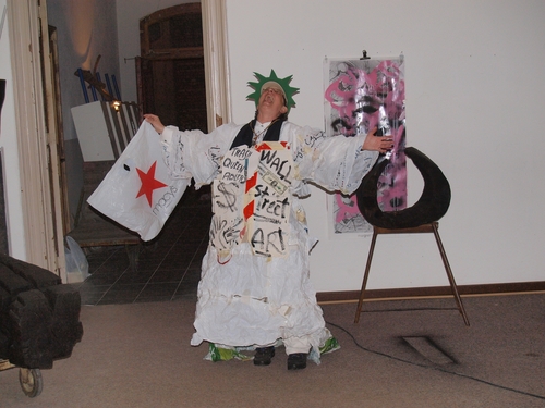Die Schmerzen der Lausitz in einer 10-minütigen Performance 10.09.2014 12:29 - Helmut Fleischhauer Zum Ansehen der Fotos in der Bilderstrecke auf eines der Fotos klicken Das 'Hypothetische Museum Museum+ Archiv' von Margret Holz zog während der langen Museumsnacht am 06.09. in die Leipziger Str. 14 ein und das 'Unbekannte Manuskript' wurde fortgeschrieben. Die Besucher waren eingeladen sich daran zu beteiligen und ihm ein Gesicht in Form von Fotos zu geben, die über an den Wänden angeordnete Spiegel aufgenommen wurden. Etwa 40 Kunstinteressierte besuchten das Atelier von Margret Holz, beteiligten sich, betrachteten die ausgestellten Kunstwerke und Artefakte vergangener Teile des 'Unbekannten Manuskriptes', kamen miteinander und mit den beiden Künstlerinnen Margret Holz und ADLER A.F. ins Gespräch und diskutierten. Um 21:00 Uhr trat als Gast die international bekannte 'Trash-Queen' ADLER A.F. mit einer Performance auf, in der sie ein die Menschen bewegendes regionales Thema aufgriff. Sie war noch nicht zu sehen aber bereits zu hören. Beim Betreten des Raumes hielt sie inne und stieß einen Schrei aus, der die Agonie der durch die Tagebaue geschundenen Natur in diesem Schrei zusammenfasste, durch die Körper der Besucher lief und die Nackenhaaare sträuben ließ. In ihrer gesamten Performance aus Mimik, Bewegung, Worten und Schreien fasste sie den Konflikt in komprimierter Form zusammen. Mal sehr laut und mal kaum hörbar. Die Gier nach Energie, die nach Schweden gehenden Gewinne von Vattenfall, die Sorge der Beschäftigten um ihre Arbeitsplätze, die geschundene, ausgeräumte Natur, die Zerstörung riesiger Flächen und die Sorge, Wut und Trauer der Menschen, die wegen der Braunkohle ihre Heimat bereits verlassen mussten und noch verlassen sollen. Jede Besucherin und jeder Besucher wird die Performance etwas anders empfunden haben Ich habe Ihre Botschaft als klares Bekenntnis gegen die hemmungslose Gier der Menschen und den rücksichtslosen Raubbau an der Natur, den Ressourcen und auch den Umgang mit den 'im Wege stehenden' Menschen verstanden. Ihre Bekleidung aus Einkaufstüten bekannter Konsumtempel, die mit Worten wie 'Wall Street' oder einem großen Dollarzeichen beschriftet waren, unterstrichen Ihre Warnung noch. Die Presse hat über frühere Auftritte Formulierungen wie … genial dadaistisch … besorgniserregender Unfug … verwendet. Mein Eindruck: „Ein sehr komplexer regionaler Konflikt genial komprimiert dargeboten.“ |