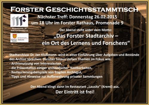 „Das Forster Stadtarchiv – ein Ort des Lernens und Forschens“, so lautete die Überschrift zum 17. Geschichtsstammtisch des Museumsvereins. Diesmal standen für den Abend nur 30 Plätzen zu Verfügung, die in wenigen Tagen schnell ausgebucht waren.