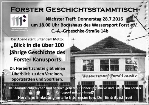 Über 100 Jahre Vereinskanusport in Forst - der nächste Geschichtsstammtisch 12.07.2016 21:00 - Frank Henschel ![]() In der Spitze gab es in Forst sieben Kanu-Vereine. Unter anderem darüber und wo ihre Sportstätten waren wird Dr. Herbert Schulze berichten. Eingeladen wird diesmal in das fantastisch gelegene Vereinshaus des Wassersport Forst e.V.. Wer diese Ecke des Mühlgrabens noch nicht gesehen hat, dem sei dieser Stammtisch umso mehr empfohlen. Treff ist wie immer am letzten Donnerstag im Monat – also am 28. Juli um 18 Uhr in der C.A. Groeschke Str. 14 b. |