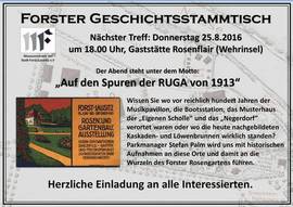 Forster Geschichtsstammtisch mit Führung zu den Wurzeln unseres Rosengartens 09.08.2016 20:00 - Frank Henschel ![]() Wussten Sie von solch ungewöhnlichen Orten wie einer Motorbootstation, einem „Negerdorf“, dem Musterhaus der Eigenen Scholle, einem Tennisplatz im Rosengarten oder haben Sie eine Ahnung wo die heute nachgebildeten Kaskaden- und Löwenbrunnen vor hundert Jahren eigentlich standen? All diesen Dingen werden wir auf den Grund gehen. Herzlich willkommen zu dieser Entdeckungswanderung. |