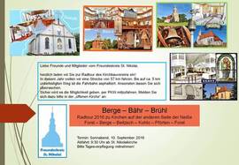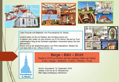 Berge – Bähr – Brühl – offene Fahrradtour des Forster Kirchbauvereins am 10. September 2016 28.08.2016 21:30 - Frank Henschel ![]() Die Tour startet am 10. September um 9.30 Uhr an der Stadtkirche St. Nikolai. Interessierte sind herzlich eingeladen. Weitere Auskünfte erteilt Frank Henschel (Handy 0172 3759660) |