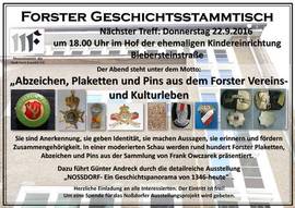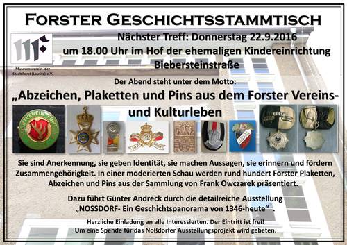 Forster Ansteckern, Plaketten und Pins stehen im Mittelpunkt des nächsten Geschichtsstammtisches 04.09.2016 21:00 - Frank Henschel ![]() Dazu gibt es Führungen durch die unglaublich detailreiche Ausstellung „NOSSDORF- Ein Geschichtspanorama von 1346-heute“ und nicht zuletzt gibt es Einblicke in ein Haus, das Stadtbaurat Dr. Rudolf Kühn 1928/1929 im Stil der „Neuen Moderne“ als Volksküche und Säuglingsheim entwickelt hat. Achtung! Treff ist nicht wie immer am letzten Donnerstag im Monat sondern eine Woche früher am 22.9. 2016 um 18 Uhr. |