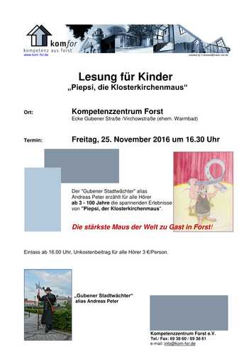 Lesung für Kinder im Kompetenzzentrum "Piepsi, die Klosterkirchenmaus" 10.11.2016 11:27 - Helmut Fleischhauer Veranstaltungsbeginn: 25.11.2016 16:30Der "Gubener Stadtwächter" alias Andreas Peter erzählt für alle Hörer in den Altersgruppen 3 bis 100 Jahre die spannenden Erlebnisse von "Piepsi, der Klosterkirchenmaus". Die stärkste Maus der Welt zu Gast in Forst! Hallo, ich bin Piepsi, die Klosterkirchenmaus. Ich hab so verrückte Geschichten erlebt, die ich euch unbedingt erzählen muss. Da, wo ich wohne, liegt das Rad der Zeit und meine Oma Mausi hat mir die Zaubersprüche beigebracht, mit denen es mich in die Vergangenheit bringt. Das hab ich natürlich ausprobiert und wurde für einen Abend die stärkste Maus der Welt. Das war schon eine aufregende Sache. Oder dann der große Mäusestreit und mein Ur-Ur-Ur-Opa Mauselius Poetikus und mein Ausflug zur 1000-jährigen Eiche. Hach, ist das alles aufregend! Ich freu mich schon riesig! |
