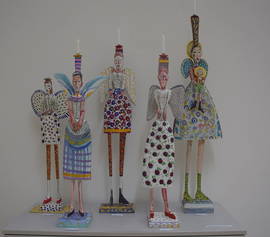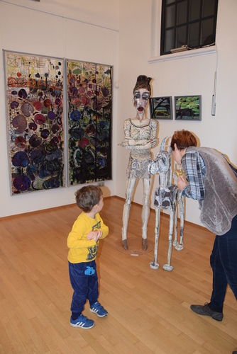 Ausstellung mit Werken von Solveig Karen Bolduan im Kompetenzzentrum Forst 14.11.2016 11:40 - Helmut Fleischhauer Zum Ansehen der Fotos in der Bilderstrecke auf eines der Fotos klicken „3D UND IN FARBE" Malerei & Plastik der bekannten Künstlerin Solveig Karen Bolduan Kompetenzzentrum Forst e.V. Gubener/ Ecke Virchowstraße Tel. (03562) 6938-60 Mo-Fr von 9 bis 14 Uhr; Besichtigungen/Führungen durch das historischen Gebäude einschl. Ausstellung nach tel. Vereinbarung od. info@kom-for.de auch zu anderen Zeiten möglich Ausgestellte Werke: Saal: 1.„Im roten Kleid“ Holz, Stoff, farbig gefasst 2.„Sitzende“ Holz, weiß gefasst 3.„Winterbild“ Mischtechnik , 250x150cm 4.„Seerosen“ Mischtechnik , 250x150cm 5.„Kopf“ Holz, farbig gefasst 6.„Mit roten Haaren“ farbig gefasst Foyer: „Seerosen“ Mischtechnik kleiner Besprechungsraum (ehem. Wannenbad) 1.„Garten hinterm Zaun“ Mischtechnik bestickt H: 2,08 m 2x 2.„Hinterm Zaun ist der Wald“ Mischtechnik, bestickt, 83x123cm 3.„Wie das Frauchen, so das Wauwauchen“ Mischtechnik genäht 4.„Kopf“ Mischtechnik genäht 5.„Bestickte Bilder“ (im Schattenfugenrahmen) 5x 6.„all the glitter and all the gold“ (Esel und goldenes Kalb) 4x Foto 1: Leuchterengel, Foto © S. Lindner Foto 2: Tagesmutti Birgit Zuchhold mit kleinen Kunstinteressierten, Foto © S. Lindner Foto 3: Solveig Karen Bolduan, Foto PM Foto 4 © H. P. Fleischhauer |