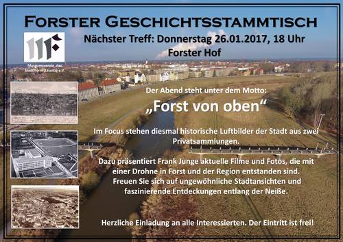 Erster Forster Geschichtsstammtisch in 2017 07.01.2017 23:30 - Frank Henschel Auch 2017 wird es wieder 11 Veranstaltungen im Rahmen des Forster Geschichtsstammtisches und der Fundusabende geben. Los geht es am Donnerstag, 26.1.2017 um 18 Uhr im Forster Hof. Unter dem Thema „Forst von oben“ werden historische Luftbilder präsentiert. Dazu dürfen wir uns über Filme freuen, die Frank Junge mit seiner Drohne über Forst und entlang der Neiße aufgenommen hat. Übrigens kommt auch eine wunderbare und einmalige Luftbildaufnahme der Stadt Forst im Morgenrot zur Versteigerung. Der Erlös des 1,50m mal 0,5m großen Posters soll mit in ein Fahrstuhlprojekt in unserem Museum fließen. Also herzlich willkommen und bitte auch weitersagen! |