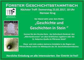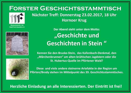 39. Geschichtsstammtisch 07.02.2017 22:00 - Frank Henschel Der kommende Geschichtsstammtisch am 23. Februar stellt alte Flurdenkmäler und andere spannende steinerne Artefakte östlich der Neiße in den Mittelpunkt. Angelehnt an die derzeitige Ausstellung im Pförtener Kavaliershaus „Geschichte und Geschichten in Stein“ werden über ein Dutzend Objekte vorgestellt, deren Geschichte oft bis ins 18. Jahrhundert reicht. Mit den mitgelieferten GPS-Daten ist manch ein Objekt mit Sicherheit eine gute Idee für die heranrückende Ausflugs- und Radfahrsaison. Treff ist diesmal am 23.2.2017 um 18 Uhr im Hornoer Krug. |