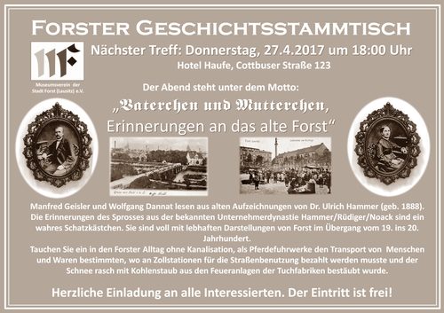 Vaterchen und Mutterchen - Erinnerungen an das alte Forst – Einladung zum 41. Forster Geschichtsstammtisch. 08.04.2017 21:00 - Frank Henschel Seit vielen Jahren forscht Manfred Geisler mit großer Ausdauer und Intensität den Forster Ehrenbürgern nach. Viele der biografischen Abhandlungen mündeten in Artikeln für das „Forster Jahrbuch“. Doch diese Forschung brachte auch manches Kleinod an Forster Geschichte wieder zurück in eine breitere Öffentlichkeit. Erinnert sei hier vor allem an Geislers Zusammensetzung der Fragmente von Aufzeichnungen des Forster Chronisten und Ehrenbürgers Friedrich Passarius. (erhältlich im Forster Textilmuseum) Zu den wertvollen „Nebenprodukten“ der Ehrenbürgerforschung zählte auch der Gedichtband von Max Fritz Hammer, der in Auszügen beim 29. Stammtisch im Jahr 2016 vorgestellt wurde. Nun steht eine neue wunderbare Entdeckung beim kommenden Stammtisch im Mittelpunkt. Manfred Geisler und Wolfgang Dannat lesen aus alten Aufzeichnungen von Dr. Ulrich Hammer (geb. 1888). Die Erinnerungen des Sprosses aus der bekannten Unternehmerdynastie Hammer/Rüdiger/Noack sind ein wahres Schatzkästchen. Sie sind voll mit lebhaften Darstellungen von Forst im Übergang vom 19. ins 20. Jahrhundert. Tauchen Sie ein in den Forster Alltag ohne Kanalisation, als Pferdefuhrwerke den Transport von Menschen und Waren bestimmten, wo an Zollstationen für die Straßenbenutzung bezahlt werden musste und der Schnee rasch mit Kohlenstaub aus den Feueranlagen der Tuchfabriken bestäubt wurde. Der nächste Geschichtsstammtisch ist am Donnerstag 27. April 2017 18.00 Uhr im Hotel Haufe |