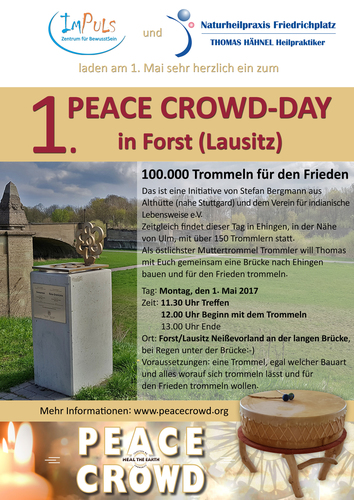 1. Peace Crowd - Day in Forst - 100.000 Trommeln für den Frieden 23.04.2017 21:00 - K. Golembiowski Eine Initiative von Stefan Bergmann aus Althütte (Nähe Stuttgart) und dem Verein für indianische Lebensweise e.V.Zeitgleich findet dieser Tag in Ehingen in der Nähe von Ulm mit über 150 Trommlern statt. Als östlichster Muttertrommel Trommler will ich mit Euch gemeinsam eine Brücke nach Ehingen bauen und für den Frieden trommeln. Tag: Montag, den 01. Mai 2017 Zeit: 11.30 Uhr Treffen 12.00 Uhr Beginn mit dem Trommeln 13.00 Uhr Ende Ort: Forst/Lausitz, Neißevorland an der langen Brücke, bei Regen unter der Brücke Voraussetzungen: eine Trommel, egal welcher Bauart und alles worauf es sich trommeln lässt und für den Frieden trommeln wollen. Mehr Infos zum Peacecrowd - Day und der Idee die dahinter steht findet ihr unter www.peacecrowd.org.INFOS und ANMELDUNG: info@impuls.team, Tel.: +49 179 5497658 Kasia Golembiowski |