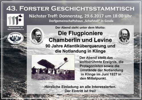 Geschichtsstammtisch am 29.6.2017 erinnert an die Landung der Amerikaner… 05.06.2017 23:00 - Frank Henschel … am 6. Juni!Während am 6. Juni 1944 sich wohl eher weniger Deutsche freuten, dass die Amerikaner in der Normandie landeten so war 17 Jahre früher, am 6. Juni 1927, genau das Gegenteil der Fall. Abertausende Deutsche jubelten zwei amerikanischen Fliegern euphorisch zu, die nonstop den Atlantik überquert hatten. Wolfgang Dannat und Frank Henschel geben Einblicke hinter die Kulissen des Rekordfluges, der die zwei Amerikaner Chamberlin und Levine bis nach Klinge führte und die anschließend das wurden, was man heute „Megastars“ nennt. Herzliche Einladung nach Gosda in den „Schafstall“. Beginn 18 Uhr Materialien (Fotos, Andenken etc.) zu diesem Ereignis sind auch diesmal gern erwünscht. |