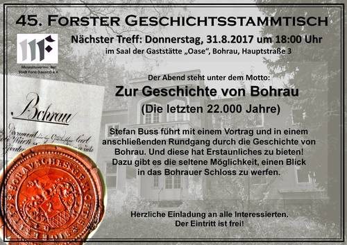 Nächster Geschichtsstammtisch führt durch Geschichte von Bohrau 13.08.2017 22:01 - Frank Henschel Nächster Geschichtsstammtisch führt durch Geschichte von Bohrau.Schon für mehrere Generationen ist Bohrau eher ein Ort mit einer bekannten Diskothek. Doch in Bohrau gibt es mehr zu entdecken und vielleicht sogar das schönste Schloss oder Herrenhaus im Forster Umland. Stefan Buss wird in einem Vortrag und auf einem Rundgang die Geschichte von Bohrau präsentieren. Gehen Sie mit ihm auf Entdeckungsreise und lassen sie sich überraschen! Donnerstag 31. August, um 18 Uhr in der Gaststätte Oase. |