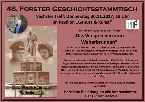 Letzter Forster Geschichtsstammtisch in diesem Jahr 10.11.2017 21:00 - Frank Henschel Oft hört man den Ausspruch: „… über diese oder jene Geschichte müsste man mal ein Buch schreiben“. Wolfgang Schenk, geboren in Forst-Berge, hat es getan. Sein Werk mit dem Titel „Das Versprechen vom Weberbrunnen“ wird nun auf dem letzten Geschichtsstammtisch in diesem Jahr erstmals vorgestellt. Donnerstag 30.11.2017, 18 Uhr im Pavillon „Genuss & Kunst“ (gegenüber der Post). Herzlich Willkommen! |