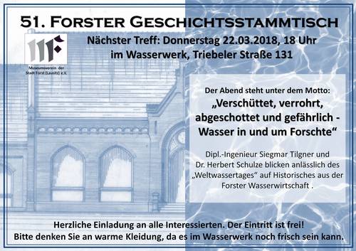 Nächster Geschichtsstammtisch im Wasserwerk 07.03.2018 18:30 - Frank Henschel Wasser ist nicht nur Leben. Gerade für das historische Forst spielte Wasser und seine Wege eine herausragende Rolle.Anstatt einer Stadtmauer waren der Mühlgraben und Lohmühlgraben der äußere Schutz für die Stadt. Gleichzeitig kam ihnen hohe Bedeutung für Handwerk und Industrie zu. Tuchmacher, Gerber, Mühlen, später die Textilfabriken und das Eltwerk siedelten sich am Wasser an. Doch Wasser ist auch bedrohlich und kann vernichtende Schäden anrichten. Schon in den frühen Biebersteiner-Zeiten griffen Forster in die Wasserläufe ein und versuchten sie zu bändigen und nutzbar zu machen. Siegmar Tilgner und Herbert Schulze blicken beim nächsten Geschichtsstammtisch auf Historisches aus der Forster Wasserwirtschaft. Donnerstag 22.03.2018 um 18 Uhr im Wasserwerk Besuchern der nächsten Veranstaltung wird empfohlen, sich etwas wärmer anzuziehen, da es im Wasserwerk noch kühl sein wird. |