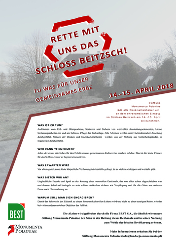 Am 14./15. April wird das Schloss in Beitzsch/Biecz aufgeräumt –Machen Sie mit! 24.03.2018 00:00 - Frank Henschel Ein hochmotivierter Verein (Fundacja Monumenta Poloniae) hat in Beitzsch/Biecz (ein Dorf hinter Pförten/Brody) begonnen, eine schon fast gänzlich verfallene Gutsanlage mit imposanten Torturm und Schloss zu retten. Am Torturm wurden schon erste Sicherungsmaßnahmen eingeleitet. Fenster wurden erneuert und eine Zwischendecke eingezogen. Nun soll auch das dazugehörige Schloss gesichert werden. Doch zuerst ist ein großes Aufräumen angesagt! Am Wochenende 14/15. April findet ein Arbeitseinsatz statt, an dem polnische und deutsche Denkmal- und Geschichtsfreunde unglaublich viel Müll aus dem Schloss beseitigen wollen. Helfende Hände werden dringend gebraucht. Der Einsatz startet jeweils um 9 Uhr. Gebraucht werden Behälter und stabile Säcke um Müll und Schutt aus dem Schloss zu tragen. Empfohlen wird das Tragen eines Bauhelms. Darüber hinaus besteht großer Bedarf an zwei Experten die mit einem Freischneider einigen Wildwuchs im Schlosspark beseitigen sollen Mehr Infos stehen auf dem Plakat oder Sie nehmen Kontakt mit Frank Henschel Tel.: 0172 3759660 auf. |