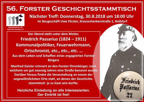 Passarius und ein ungewöhnlicher Veranstaltungsort stehen im Mittelpunkt des 56. Forster Geschichtsstammtisches. 09.08.2018 20:00 - Frank Henschel Nanu, ein Geschichtsstammtisch in einem Noßdorfer Baubetrieb?! Vielen ist vielleicht noch das alte BHG-Geschäft am südwestlichen Ende des Noßdorfer Dorfangers ein Begriff. Tatsächlich verbirgt sich hinter den Mauern eine alte Gastwirtschaft mit einem Festsaal, der durchaus Erinnerungen an den Saal im Forster Hof aufkommen lässt. Inhaber Uwe Förster müht sich seit Jahren, die alte Bauernschänke oder „Strasse´s Restaurant“ zu erhalten. In diesem Zusammenhang bittet er die Stammtischbesucher, Bilder mitzubringen, die die alte Gastwirtschaft von innen und außen zeigen. Durchaus passend zum gründerzeitlichen Ambiente der Veranstaltung stellt Manfred Geisler in seinem Vortrag den Forster Ehrenbürger Friedrich Passarius in den Mittelpunkt. Seit Jahren versucht Geisler das Leben von Passarius nachzuzeichnen und in einer akribischen Puzzlearbeit die verstreuten und verschollenen Tagebuchaufzeichnungen und Bilder aus dem alten Forst zusammenzufügen. Drei für die Heimatforschung herausragende Hefte mit einer Bibliografie zu Passarius-Schriften konnte er bisher der Öffentlichkeit präsentieren. Auch dieser Abend soll der Passarius-Forschung neuen Schwung verleihen. Geisler bittet die Stammtischbesucher, jeden noch so kleinen Informationsschnipsel im Zusammenhang mit Friedrich Passarius mitzubringen. Erinnert sei hier an die Dauersuchen, die in der Rubrik „Verschollenes“ der Forster Kulturwegeseite stehen. http://www.kulturwege-forst-lausitz.de/inhalte/verschollen-68589.php http://www.kulturwege-forst-lausitz.de/inhalte/verschollen-68660.php Frank Henschel f.henschekl@gmx.de |