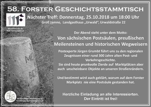 58. Forster Geschichtsstammtisch am 25. Oktober 2018 um 18 Uhr in der Gaststätte „Urwald“ - Groß Jamno. Im Mittelpunkt des Abends stehen sächsische Postsäulen, preußische Meilensteine und alte Wegweiser. Heute sind vor allem die Postmeilensäulen echte Schmuckstücke auf prädestinierten Plätzen der Region. Doch darüber hinaus gibt es eine Menge unscheinbare Objekte an unseren Straßenrändern, die von einer rund 300 Jahre alten Verkehrs- und Postgeschichte künden.