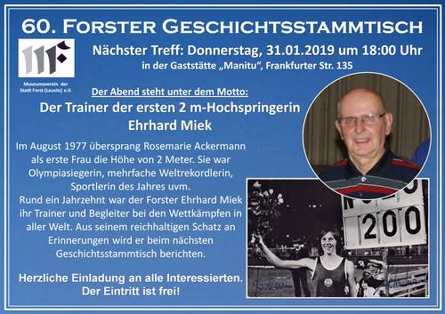 Im Sommer 1977 übersprang Rosemarie Ackermann vom SC Cottbus bein Istaf in Berlin als erste Frau die Höhe von zwei Meter. Damit schrieb Olympiasiegerin von 1976 Sportgeschichte. Doch nur Wenige wissen, dass ein Forster, nämlich Ehrhard Miek, maßgeblichen Anteil an Ackermanns Erfolgen hatte. Als Trainer begleitete er sie zu drei Olympiaden und zu anderen sportlichen Höhepunkten. Beim 60. Forster Geschichtsstammtisch in der Gaststätte Manitu wird er von diesen Erfahrungen und Erlebnissen berichten.