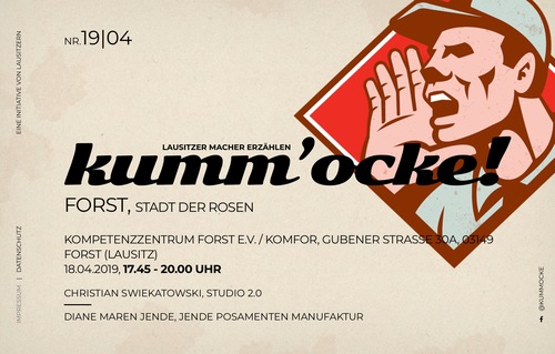 LAUSITZER MACHERINNEN ERZÄHLEN ... diesmal in Forst 17.04.2019 05:00 - Frank Henschel Außergewöhnliche Orte, besondere Menschen und spannende Geschichten.An jedem 3. Donnerstag im Monat kommen an wechselnden Orten je zwei MacherInnen zu Wort, die von ihrem Leben und Wirken in der Lausitz berichten. Diesmal im Gespräch: CHRISTIAN SWIEKATOWSKI vom STUDIO 2.0 und DIANE MAREN JENDE von der JENDE POSAMENTEN MANUFAKTUR. KOMPETENZZENTRUM FORST E.V. / KOMFOR, GUBENER STRASSE 30A, 03149 FORST (LAUSITZ) 18.04.2019, 17.45 - 20.00 UHR |