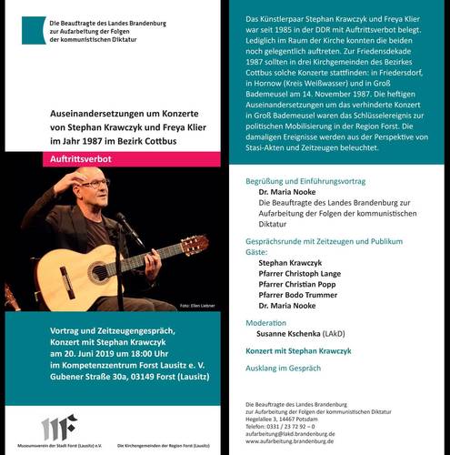 65. Forster Geschichtsstammtisch "Auftrittsverbot" 20. Juni um 18 Uhr 31.05.2019 21:30 - Frank Henschel Der 65. Forster Geschichtsstammtisch ist eine Gemeinschaftsveranstaltung. Zusammen mit der Beauftragten zur Aufarbeitung der Folgen der kommunistischer Diktatur, Frau Dr. Maria Nooke und den regionalen Kirchengemeinden wird es einen Rückblick in das Jahr 1987 geben.Im Mittelpunkt stehen die Ereignisse um ein geplantes Konzert in der Kirche von Groß Bademeusel und seine Folgen. Das Künstlerpaar Freya Klier und Stephan Krawczyk sollten hier im November 1987 auftreten. Viele Menschen waren in die kleine Kirche nach Bademeusel gekommen. Doch das Konzert fand nicht statt. Mit Zeitzeugen aber auch mit Unterlagen der ehemaligen Staatssicherheit soll den damaligen Ereignissen noch einmal nachgespürt werden. Im Anschluss gibt der Liedermacher Stephan Krawczyk ein Konzert. Donnerstag 20. Juni 2019, 18 Uhr im Kompetenzzentrum, Gubener Straße 30a, Der Eintritt ist frei. |