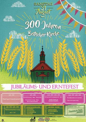 300 Jahre Kirche in Beitzsch/Biecz - Jubiläums- und Erntefest am 31. August 2019 02.08.2019 21:00 - Frank Henschel Eine der berühmtesten Kirchen der Region begeht ihr 300. Bestehen. Ihr Bau vollzog sich in den Jahren 1716-1719. Die Kirche in Beitzsch/Biecz wird dem Baumeister George Bähr (1666-1738 zugeschrieben. Nach seinen Plänen begann man 1726 mit dem Bau der Frauenkirche in Dresden. In ihrer Art kann die Kirche in Beitzsch/Biecz als Vorgängerbau der Frauenkirche angesehen werden. Die Veranstaltung beginnt um Samstag den 31. August um 12 Uhr mit einem Festgottesdienst und geht dann über in ein buntes Fest mit Unterhaltung (siehe Plakat) |