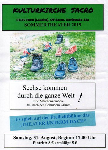 Sommertheater an der Kulturkirche Sacro 15.08.2019 20:01 - Frank Henschel Zum Stück "Sechse kommen durch die Welt" eine Märchenkomödie frei nach den Gebr. Grimm lädt die Gruppe "Theater unterm Dach" an die Kulturkirche nach Sacro ein. Samstag. 31 August, Beginn 17 Uhr Eintritt 8 Euro/erm. 5 Euro |
