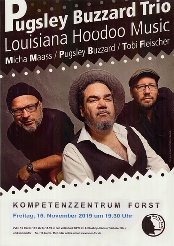„Pugsley-Buzzard-Trio“ AUS/D - 15.11.2019 im Kompetenzzentrum 14.11.2019 00:00 - Helmut Fleischhauer Veranstaltungsbeginn: 15.11.2019 19:30 Uhr im Forster Kompetenzzentrum"Blues im komfor 2019" mit dem neuesten Programm + CD 2019 und den besten, beliebtesten Ohrwürmern…! The Big Voice from Down Under Pugsley ist Musiker, Schauspieler, Fernsehkoch und liebenswerter Grizzly mit Hut. Diesen Mann aus Down Under solltest Du nicht verpassen! Eine Mischung aus Doctor John und Tom Waits. Der coolste Pianospieler Australiens mit dem witzigen Namen Pugsley Buzzard kommt nach Europa. Mit seinem Barrelhouse Piano-Stil und seiner ungewöhnlich rauchigen Stimme spielt er in kleiner Besetzung den großen New Orleans Sound aus der Zeit der Daddys, Dandies, Girlies und sexy Mamas. Seine Musik bezeichnet er selbst als New Orleans Voodoo Boogie. Pugsley Buzzard - vocals, piano Tobi Fleischer - bass Micha Maass - drums VVK.: 16 €/erm. 13 € für Schüler, Studenten, Arbeitslose AK 18 €/erm.15 €. VVK ab 04.11.-13.11. im „LOTTOSHOP Karius“ (Triebeler Str.); in der Volksbank SPN zu den Öffnungszeiten; sowie im komfor von 9-14 Uhr oder online unter www.kom-for.de |