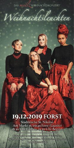 WEIHNACHTSLEUCHTEN - Konzert mit den MEDLZ - 19. Dezember 05.11.2019 22:10 - Frank Henschel Nach dem umjubelten Weihnachts-Konzert im vorigen Jahr kommen sie in diesem Jahr noch einmal in die Forster Stadtkirche St. Nikolai: Die MEDLZ!Das Konzert beginnt am 19. Dezember 2019 um 19.30 Uhr. Stadtkirche. Die Karten zum Preis von 28,-€ im VVk (32,-€ an der AK) sind ab Ende September im Gemeindebüro, im Gutenberg-Haus, in der Touristinformation und unter www.reservix.de erhältlich. Und hier noch ein Hörbeispiel: https://www.youtube.com/watch?v=chUVmPvm1Bk |