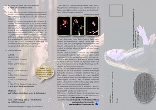 GOSPELWORKSHOP und Konzert in Forst am Samstag/Sonntag 13./14.06.2020 15.02.2020 19:00 - Frank Henschel Wer Gospel singen mag oder mal probieren möchte, wer überhaupt gern singt … und sei es unter Dusche ... jeder ist willkommen! Mit ein paar ordentlichen Proben mündet dann alles in einem begeisternden Gospel-Konzert in der Forster Stadtkirche! Infos und Anmeldung findet man im Flyer oder hier: https://www.carmenwutzler.de/anmeldeformular-gospelworkshop-forst2020.html. |