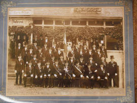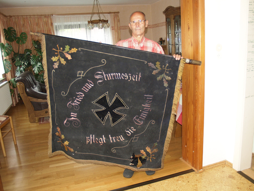 Ein außergewöhnlicher Dachbodenfund in Groß Jamo 30.08.2014 13:00 - Helmut Fleischhauer Vor nicht all zu langer Zeit wurde auf einem Dachboden in Groß Jamno eine Fahne aus dem Jahre 1901 gefunden. Es handelt sich dabei um die Fahne des Jamnoer Kriegervereins. Auf einem Schild am Flaggenstock ist 'Heinrich Peucker, Grünberg i. Schl.', vermutlich der Hersteller, zu lesen. Interessant sind eine Vielzahl von Plaketten benachbarter Kriegervereine am Fahnenstock, die alle das Datum 8.7.1927 tragen. Roland Hornick in seiner Eigenschaft als Ortsvorsteher recherchiert nun die Hintergründe. Warum ist die Fahne ein außergewöhnlicher Fund? Dazu gehen wir ein wenig in die Geschichte zurück. Nach der Gründung des Deutschen Reichs im Jahre 1871 wurden 'Kriegervereine' in Erinnerung an den Deutsch-Französischen Krieg gegründet und waren sehr populär. Etwa 29.000 Kriegervereine gab es Anfang des 20. Jahrhunderts im Deutschen Reich. Eine wichtige Aufgabe der Vereine waren die Unterstützung der Kriegsversehrten und die Familien der Gefallenen. 1896 wurde mit Geld, das die Kriegervereine gesammelt hatten, ein Mahnmal auf dem Kyffhäuser Berg zur Erinnerung an die Deutsche Einheit erbaut. Der vier Jahre später, im Jahre 1900, gegründete „Deutsche Reichskriegerbund Kyffhäuser“ wurde die Dachorganisation der Kriegervereine. Die Kriegervereine waren nach der Ersten Weltkrieg auch meist die Initiatoren für den Bau von Gefallenendenkmalen, die in fast jeder Gemeinde zu finden sind. 1932 rief der der Kyffhäuserbund seine über 2 Millionen Mitglieder auf, bei der bevorstehenden Wahl des Reichspräsidenten die Stimme Paul von Hindenburg zu geben und nicht Adolf Hitler. Nach der Machtübernahme der Nationalsozialisten verfügte Hitler 1937 die Umbenennung des traditionsbewussten Kyffhäuserbunds in „NS-Reichskriegerbund“. Damit begann auch das Ende der Kriegervereine. 1943 wurde der Verein endgültig aufgelöst. Mit dem Einmarsch der Alliierten Ende des II. Weltkrieges landeten viele Unterlagen und Fahnen in den Öfen um nicht als Militarist dazustehen. Es ist also ein sensationeller, historischer Fund. Diese Fahne hat alle politischen Veränderungen und Wirren überstanden. Fotos 2, 3: Roland Hornick mit der Fahne des Kriegervereins © Helmut P. Fleischhauer Foto 1: vermutlich 1926, Mitglieder der Kriegervereins, Sammlung Roland Hornick |