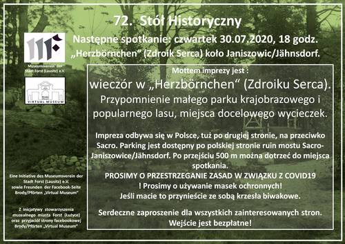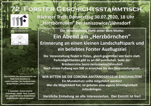 72. Forster Geschichtsstammtisch – Ein Abend am „Herzbörnchen“ 30. Juli 2020 um 18 Uhr . 15.07.2020 16:00 - Frank Henschel Der kleine Landschaftspark „Herzbörnchen“ zählte vor dem 2. Weltkrieg zu den beliebtesten Ausflugzielen in der Umgebung von Forst. Der Forster Museumsverein und Freunde der Facebook-Seite „Brody/Pförten –Virtual Museum“ wollen an dem Abend an diese Anlage erinnern und auf Spurensuche gehen. Wie erreichen Sie den Veranstaltungsort? Das „Herzbörnchen“ liegt rund 500 Meter hinter der Ruine der ehemaligen Sacroer Neißebrücke auf der polnischen Seite. ANFAHRT: Benutzen Sie den Grenzübergang Forst-Sacro und fahren Sie bis zur Apexim AB Tankstelle. Dort links abbiegen. Fahren Sie durch das nächste Dorf Janiszowice/Jähnsdorf. Rund 300 Meter hinter dem Dorf ist links die Ruine der ehemaligen Brücke. Parken Sie hier und laufen Sie den Feldweg nach Osten. In etwa 500 Meter erreichen Sie den Veranstaltungsort. ES WIRD GEBETEN DIE CORONA-ABSTANDSREGELN EINZUHALTEN! Ein Mund/Nasenschutz sollte mitgeführt werden! Wer die Möglichkeit hat, ist gebeten eine eigene Sitzmöglichkeit mitzubringen. Bei Fragen rufen Sie bitte die 0172 3759660 an. |
