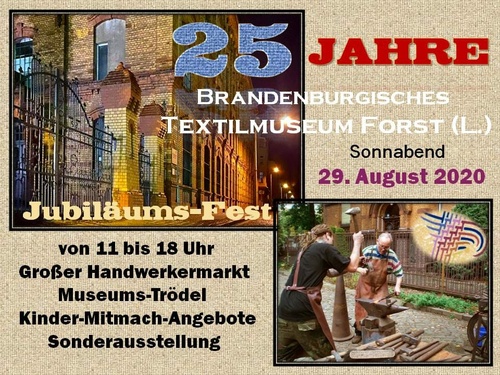 25 Jahre Brandenburgisches Textilmuseum in Forst - das Jubiläumsfest am 29. August 2020 23.08.2020 22:20 - Frank Henschel Zum Jubiläumsfest mit Handwerkermarkt lädt der Forster Museumsverein herzlich ein. Samstag 29. August, 11-18 Uhr |