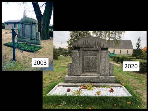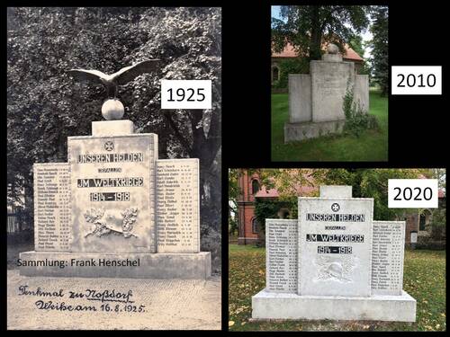 Bündnis Noßdorf restauriert zwei Gefallenen-Denkmäler 23.10.2020 15:00 - Frank Henschel Bündnis Noßdorf restauriert zwei Gefallenen-Denkmäler Das Gefallenendenkmal auf dem Noßdorfer Kirchhof und das Turnerdenkmal auf dem Friedhof wurden in diesem Jahr saniert. Besonders aufwendig ist dies am Denkmal vor der Kirche geschehen. Die Bekrönung mit dem Adler steht zwar erst in Kürze an, aber der abgeschlagene Schmuck im mittleren Feld wurde vom Steinmetz Heiko Dorn nach der alten Vorlage neu gestaltet. Darüber hinaus wurde das Denkmal gereinigt, Schäden beseitigt und die Schrift erneuert. Das vor 95 Jahren (1925) eingeweihte Denkmal stammt ursprünglich aus der Werkstatt des Forster Bildhauers Clemens Schickel aus der Frankfurter Straße 55. Auch das Denkmal für die im 1. Weltkrieg gefallenen Noßdorfer Turner wurde hergerichtet und die Anlage insgesamt neu angelegt. Frank Henschel f.henschel@gmx.de |