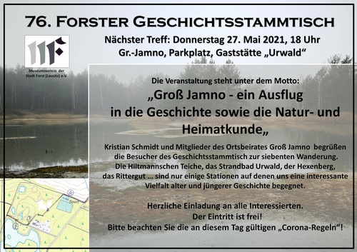 Geschichtswanderung in Groß Jamno und Umgebung - 76. Forster Geschichtsstammtisch 17.05.2021 16:00 - Frank Henschel Geschichtswanderung in Groß Jamno und Umgebung. Wanderung zu den Hiltmannschen Teichen über das „Strandbad Urwald“, den Hexenberg nach Groß Jamno – der 76. Forster Geschichtsstammtisch widmet sich diesmal der Natur-, Geschichts- und Heimatkunde von Groß Jamno (abgeleitet von „Jama“ - sorbisch für Grube). Kennen Sie die alten Pläne vom „Strandbad Urwald“ aus dem Jahr 1969, wissen Sie was den Badesee (Waldsee) mit dem „Tranitzer Fluviatil“ verbindet, wo die Waldquellen oder der Hexenberg liegen oder was es über die Hiltmannschen Teiche zu berichten gibt? Zur Groß Jamnoer Geschichte gehört auch das ehemalige Rittergut, die „Lurre“ oder manch eine Persönlichkeit. All dies soll beim 76. Forster Geschichtsstammtisch erwandert und erkundet werden. Kristian Schmidt und Mitglieder des Ortsbeirates begrüßen die Interessierten zur Veranstaltung des Museumsvereins der Stadt Forst (Lausitz) e. V. Die Wanderung wird etwa zwei Stunden andauern. Festes Schuhwerk wird empfohlen. Zudem gelten die an diesem Tag gültigen „Corona-Regeln“. Termin: Donnerstag, den 27. Mai 2021, 18.00 Uhr Treffpunkt: Parkplatz Landgasthof „Urwald“ |