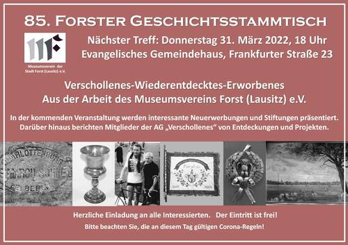 85. Forster Geschichtsstammtisch Verschollenes-Wiederentdecktes-Erworbenes 23.03.2022 11:00 - Frank Henschel Am kommenden 85. Forster Geschichtsstammtisch präsentieren Mitglieder des Museumsvereins die jüngsten Stiftungen und Neuerwerbungen für die Forster Museumssammlung.Vorgestellt werden einmalige Objekte und Geschichten, die sich damit verbinden. Ergänzt wird der Abend durch Informationen zu Entdeckungen und gelösten Rätseln aus der Arbeitsgruppe „Verschollenes“. |