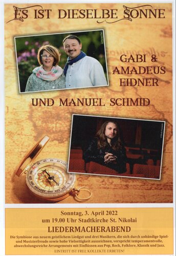 Liedermacherabend „Es ist dieselbe Sonne“ 29.03.2022 19:00 - Frank Henschel 3. April +++ 19 Uhr +++ StadtkircheNach sieben erfolgreichen Familien-Singspiel-Produktionen, mit denen sie als lustige Holzwürmer Bohra & Bohris in unzähligen Kinder- und auch Erwachsenenherzen für Begeisterung gesorgt haben, kehren die Liedermacher Gabi und Amadeus Eidner aus Chemnitz zu ihren Wurzeln zurück. Den beiden Alben 'Spürst du noch den Wind' und 'Jesus ist die Mitte meiner Welt' folgt 'Es ist dieselbe Sonne'. Nach vielen Jahren freischaffender Liedermachertätigkeit mit tausenden Auftritten im deutschsprachigen Raum haben sie sich eine herausragende musikalische Verstärkung sowohl ins Live- als auch ins Studio-Boot geholt: Manuel Schmid - Sänger, Keyboarder, Percussionist, Komponist, Texter, Arrangeur, Produzent, Toningenieur und nicht zuletzt aktueller Frontmann der Ostrock-Legende 'Stern Meissen'. Das vorliegende Album beinhaltet sowohl Musiken und Texte aus der Schaffensperiode von Gabi & Amadeus Eidner als auch gemeinsam mit Manuel Schmid geschriebene Kompositionen. Die Symbiose aus neuem geistlichen Liedgut und drei Musikern, die sich durch unbändige Spiel- und Musizierfreude sowie hohe Vielseitigkeit auszeichnen, verspricht temperamentvolle, abwechslungsreiche Arrangements mit Einflüssen aus Pop, Rock, Folklore, Klassik und Jazz. |