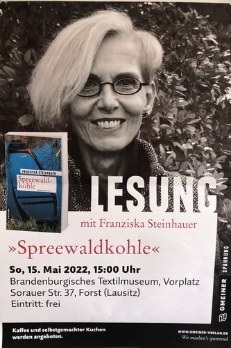 Krimi-Lesung im Museumshof 20.04.2022 23:30 - Frank Henschel In der nächsten Zeit soll es mehrer Lesungen im Hof oder auf dem Vorplatz des brandenburgischen Textilmuseums gegeben. Den Aufrakt macht am Sonntag den 15. Mai um 15 Uhr die Krimi-Autorin Franziska Steinhauer |