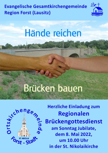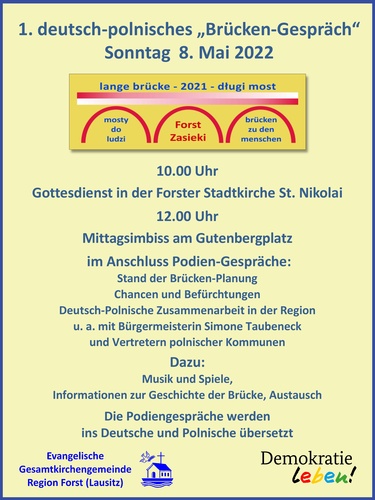 1. Deutsch-Polnisches Brückengespräch 29.04.2022 22:50 - Frank Henschel 1. Deutsch-Polnisches BrückengesprächIm vergangenen Jahr haben die Forster Stadtverwaltung und die Stadtverordnetenversammlung erneut einen Prozess für den Aufbau einer Innenstadtbrücke über die Neiße angestoßen. Es ist nicht der erste Anlauf. Diesmal wollen BürgerInnen von beiden Seiten der Neiße diesen Prozess begleiten und zu einem positiven Abschluss verhelfen. Viele Hoffnung und Visionen verknüpfen die Protagonisten mit einem solchen Brückenschlag. Doch ohne Frage gibt es auch Bedenken, Zweifel und Vorurteile. Das 1. Deutsch-Polnische Brückengespräch mit dem einführenden Gottesdienst in der Stadtkirche St. Nikolai soll diesen Dingen einen Raum geben. Herzlich Willkommen an alle Interessierten. |