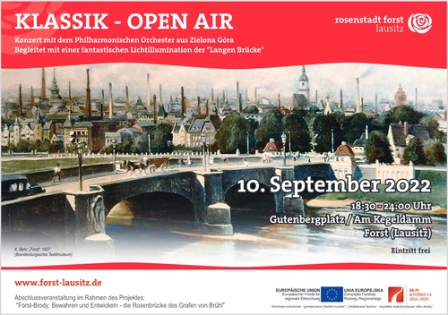 Rosenbrücke und 100 Jahre Lange Brücke - Festkonzert und Lichtshow 27.08.2022 22:05 - Frank Henschel In diesem Jahr wird die Forster "Lange Brücke" 100 Jahre alt. Gleichzeitig findet auch das Projekt "Rosenbrücke des Grafen Brühl" seinen Abschluss. Aus diesem Anlass spielt das Philharmonische Orchester aus Zielona Gora ein Festkonzert an der „Langen Brücke“ und eine Lichtershow wird die Ruine neu in Szene setzen. Samstag 10.9.2022 ab 18.30 Uhr |