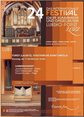 24. INTERNATIONALES KAMMER- UND ORGELMUSIK-FESTIVAL FORST (LAUSITZ) UND LUBSKO 29.08.2022 22:05 - Frank Henschel ... am 11. September 2022 - 16 Uhr in der StadtKirche St. NikolaiMusikbegeisterte dürfen sich auf die nun schon 24. Auflage dieses Internationalen Musikfestivals freuen. Unter der künstlerischen Leitung von Michal Kocot erwartet die Gäste in diesem Jahr unter anderem ein fantastisches Zusammenspiel zwischen Violine und Cello mit hochkarätigen Solisten. Mitwirkende: Jarosław Nadrzycki – Violine Karol Marianowski – Violoncello Krzysztof Lukas – Organist Jarosław Nadrzycki (Violine) zählt zu den profiliertesten Violinisten seiner Generation. Er debütierte im Alter von 12 Jahren und ist Absolvent der Ignacy-Jan-Paderewski Musikhochschule in Posen in der Klasse von Prof. Jadwiga Kaliszewska, der Universität Mozarteum Salzburg in der Klasse von Prof. Igor Ozim und der Royal Academy of Music in London in der Klasse von Prof. Igor Petrushevski. Jarosław Nadrzycki ist Sieger vieler renommierter internationaler Violinen-Wettbewerbe, u.a. genannt: Aram-Chatschaturjan-Wettbewerb in Erewan, George-Enescu-Wettbewerb in Bukarest, Max-Rostal-Wettbewerb in Berlin, J. Heifetz-Wettbewerbs in Vilnius, „Valsesia Musica” in Varallo und Haverhill Sinfonia Solist Competition in Großbritannien. Karol Marianowski (Violoncello) ist weltweit einer der herausragendsten Cellisten seiner Generation und Preisträger vieler internationaler Wettbewerbe. Er studierte an den renommiertesten Musikhochschulen: der Fryderyk Chopin University of Music, dem Boston Conservatory, der Universität der Künste in Berlin, der Escuela Superior de Musica Reina Sofia und der Chapelle Musicale Reine Elizabeth in Brüssel. Seine Ausbildung erhielt er von renommierten Cello-Mentoren wie Ivan Monighetti, Tobias Kühne, Daniil Shafran, Milos Sadlo, Sergiej Roldugin, Tsuyoshi Tsutsumi, Andrew Mark, Kazimierz Michalik und Andrzej Bauer. Krzysztof Lukas (Organist) erhielt seine Ausbildung zunächst in Katowice/Polen, dann in Stuttgart, ergänzt durch die Teilnahme an vielen Orgelakademien und Interpretationsmeisterkursen bei nahezu allen bedeutenden Organisten Europas. Bereits mit 18 Jahren war er Preisträger bei einem nationalen Orgelwettbewerb in Inowroclaw/Polen. Später gewann er fünf erste Preise bei internationalen Orgelwettbewerben, u.a. in Rumia/Polen 1998, in Rom 2001 und beim Nicolas de Grigny Wettbewerb in Bitche (Frankreich). Konzertreisen führten ihn in viele europäische, afrikanische und asiatische Länder. So trat er u.a. mit Erfolg in der Westminster Cathedral, im Stephansdom und im Radiokulturhaus in Wien, in der anglikanischen Kirche in Rom, in der St. Therese Kirche in Genf, in der Meistersingerhalle in Nürnberg, in Lilia Hall in Tokyo, in Minato Mirai Hall in Yokohama, in der Kyungdung Kirche in Seoul, in der Basilika Notre Dame d’Afrique in Algier, in der Basilica di S. Antonio in Bologna, im Dom zu Kattowitz, in Warschau, Moskau, Krakau und Leżajsk auf. Seit 1999 ist er Kirchenmusiker in der ev. Kirchengemeinde in Stuttgart-Feuerbach. Zudem ist er Adjunkt-Professor für Orgel an der Staatlichen Hochschule für Musik “Karol Szymanowski” in Kattowitz. 2013 promovierte er zum “Doktor der musikalischen Kunst”. Er führt Seminare und Meisterkursen über die Interpretation der Orgelmusik in Europa und in Asien durch. Einlass ist ab 15:30 Uhr, das Konzert beginnt um 16:00 Uhr (Ende 18:00Uhr) Der Eintritt ist frei - es wird um eine Kollekte gebeten! |