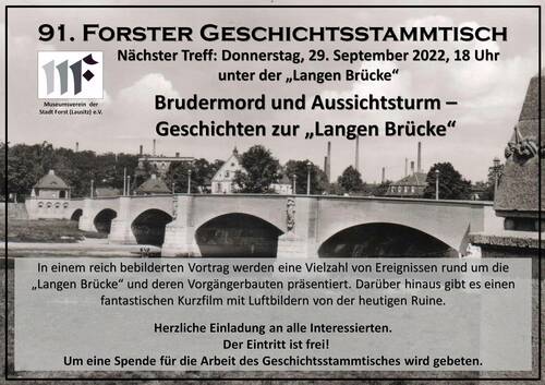 Brudermord und Aussichtsturm - Geschichten zur Langen Brücke -91. Forster Geschichtsstammtisch 20.09.2022 21:00 - Frank Henschel Brudermord und Aussichtsturm – sind nur zwei von vielen Geschichten rund um die „Lange Brücke“,Die kommende Veranstaltung wird diesmal unter dem ersten Brückenbogen der "Langen Brücke" stattfinden. Hier erwarteten die Besucher eine reich bebilderte Präsentation und ein Kurzfilm mit Luftbildaufnahmen von der derzeitigen Ruine. Einige Sitzgelegenheiten stehen bereit. Zur Sicherheit können aber auch eigene Stühle mitgebracht werden. Donnerstag 29. September, 18 Uhr |
