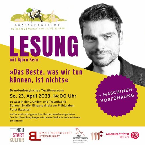 Lesung in der Traumfabrik - 23. April 17.04.2023 16:00 - Frank Henschel Am 23. April liest Björn Kern aus »Das Beste, was wir tun können, ist nichts« in Forst (Lausitz)Ort: Gründer- und Traumfabrik in der Sorauer Straße, Eingang direkt am Mühlgraben Beginn: 14 Uhr Der Eintritt ist frei, eine Spende für die Ukraine-Hilfe wird erbeten. In seinem Buch ›Das Beste, was wir tun können, ist nichts‹ erzählt Björn Kern, wovon wir alle träumen: Mehr Zeit, weniger Arbeit, mehr Leben. Wunderbar komisch und charmant schildert er seinen ganz eigenen Abschied von Fleiß und Tatendrang hin zu mehr Gelassenheit. »Früher war ich effizient, leistete sogar Multitasking. Eine scheußliche Fähigkeit, die einem noch fragilen Nichtstun schnell Schaden zufügt. Es kam vor, dass ich links das Kind auf dem Arm hielt, während ich rechts die Maus bediente, dabei aber telefonierte. In meinen dunkelsten Stunden kaufte ich bei Tchibo ein und rief bei Hotlines an. Bis mir klar wurde: So konnte es nicht weitergehen. Was war zu tun? Irgendwann ging es mir auf: Nichts!« Gemeinsam mit der Buchhandlung Berger, den Fischer Verlagen und dem Museumsverein Forst (Lausitz), der wieder für das leibliche Wohl sorgen wird, freut sich das Museum, ein Highlight aus diesem herrlich bunten Programm zu bieten, und sagt HERZLICH WILLKOMMEN zum Bücherfrühling Brandenburg 2023! |