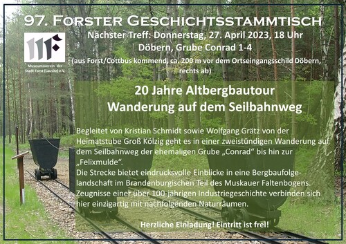 97. Forster Geschichtsstammtisch – Wanderung: „20 Jahre Altbergbautour“ 17.04.2023 16:05 - Frank Henschel Am Donnerstag, den 27. April 2023 um 18.00 Uhr, Treffpunkt: 03159 Döbern, Grube Conrad 1-4 (ca. 200 m vor dem Ortseingangsschild Döbern, rechts ab, aus Cottbus/Forst kommend).Diese Wanderung führt auf ein kleines, gut begehbares Teilstück der ca. 22 km langen Altbergbautour – den Seilbahnweg der ehemaligen Grube „Conrad“ bis hin zur „Felixmulde“. Auf dem heutigen Radweg entlang gehend, bieten sich eindrucksvolle Einblicke in eine Bergbaufolgelandschaft im Brandenburgischen Teil des Muskauer Faltenbogens. Zeugnisse einer über 100-jährigen Industriegeschichte verbinden sich mit nachfolgenden Naturräumen, zu teils einzigartig anzusehenden Landschaftsbildern. Gemeinsam mit Wolfgang Grätz von der Heimatstube Groß Kölzig, einem ausgewiesenen Kenner des Grubenfeldes „Conrad“, gehen wir auf diese 2-stündige Wanderung. Die Veranstaltung ist wie immer kostenfrei, um eine Spende wird gebeten. |