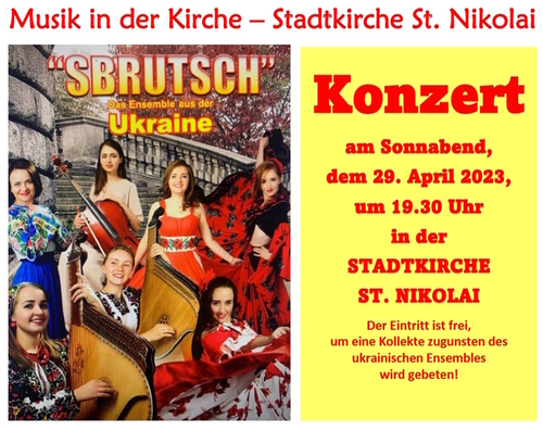 SBRUTSCH- Das Ensemble aus der Ukraine 23.04.2023 23:00 - Frank Henschel Das aus Ternopil stammende Ensemble Sbrutsch spielt und singt im ersten Teil des Konzertes religiöse und klassische Musik, im zweiten Teil repräsentieren sie ukrainische Volkslieder und Volksmusik.Der Eintritt ist frei, um Kollekte, die ukrainischen Hilfsprojekten zukommen, wird gebeten! Samstag 29. April um 19:30 in derr Forster Stadtkirche |